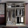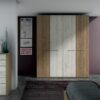 Armario de cuatro puertas lisas abatibles que combina madera con acabados Oslo y Alaska.